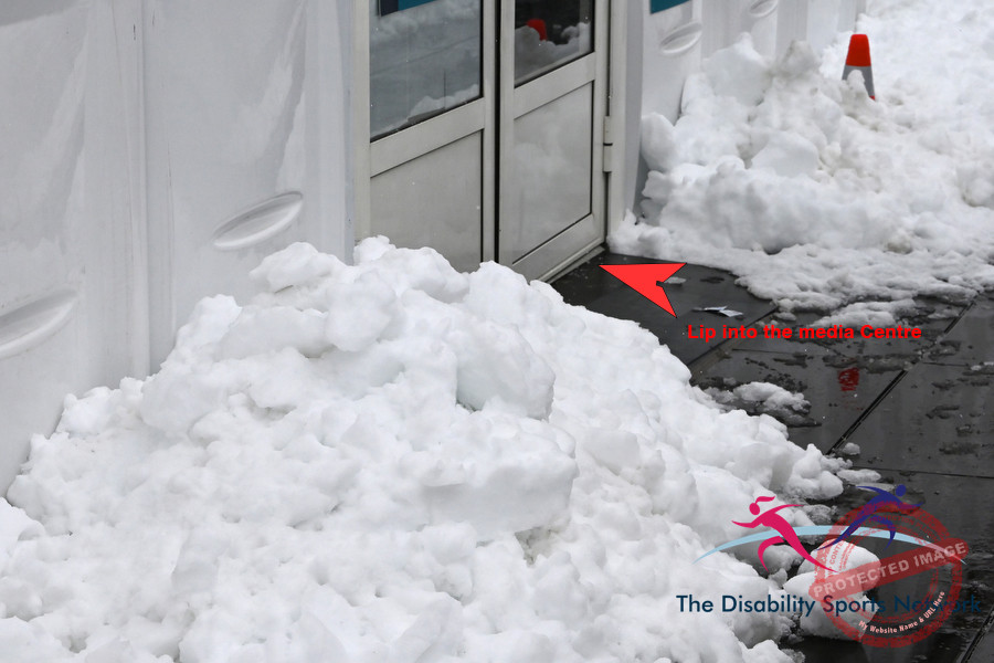 The main media centre in Cortina, was on a slope down a small hill and then up another one to the deck where you could enter the centre. Step 1 all doors had bumps of up to 10mm and all doors were manually operated, OK its a temp structure, but I know of at least 2 wheelchair users of this tented area. The toilets where on the other side of the path and yes again there was a disabled toilet with a smaller bump to get in. When inside the media tent, down the side of the lockers there was a cable run that you had to step over, could be classed as a trip hazard to get to the lockers, wheelchair users beware.